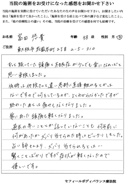東大阪市 富田 悠貴 様 38歳 女性(1回)